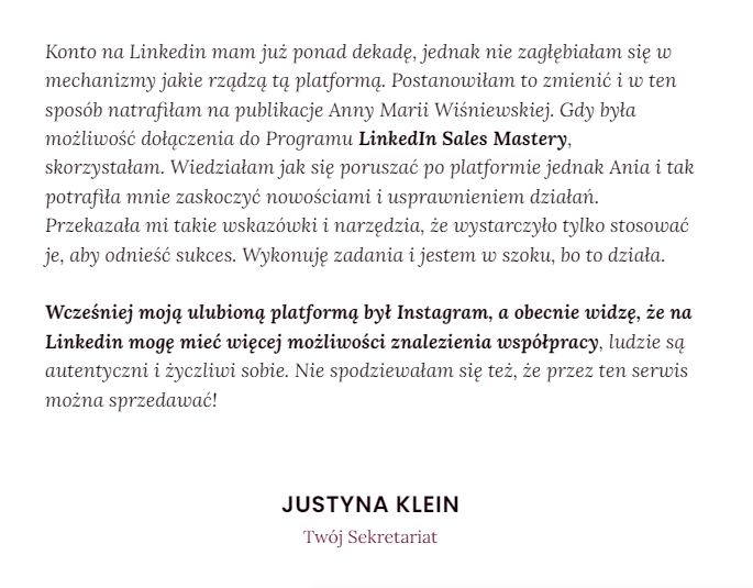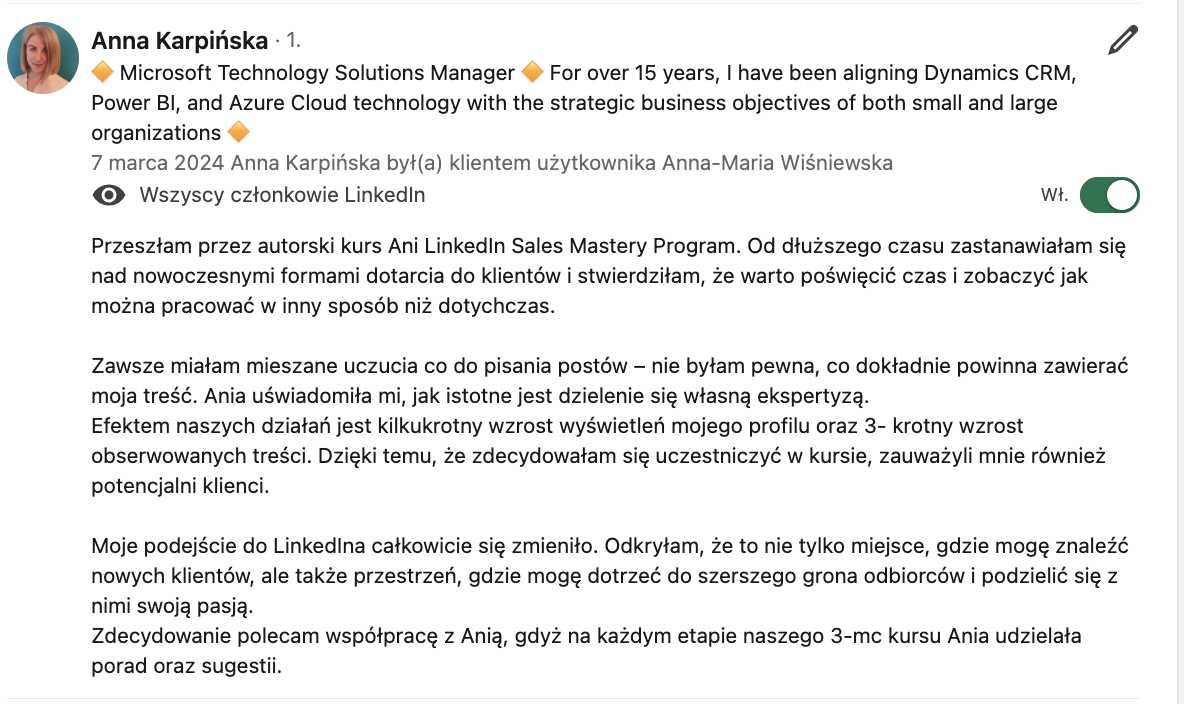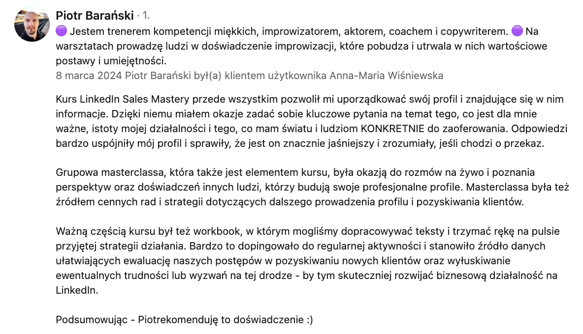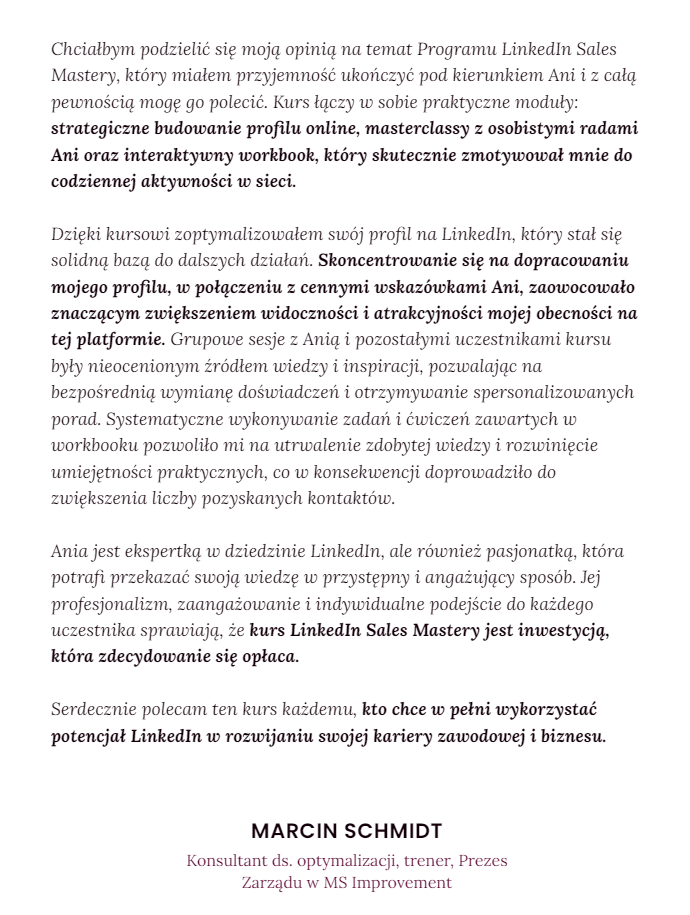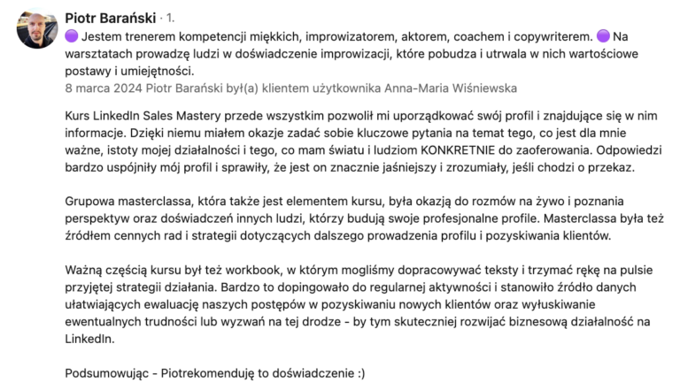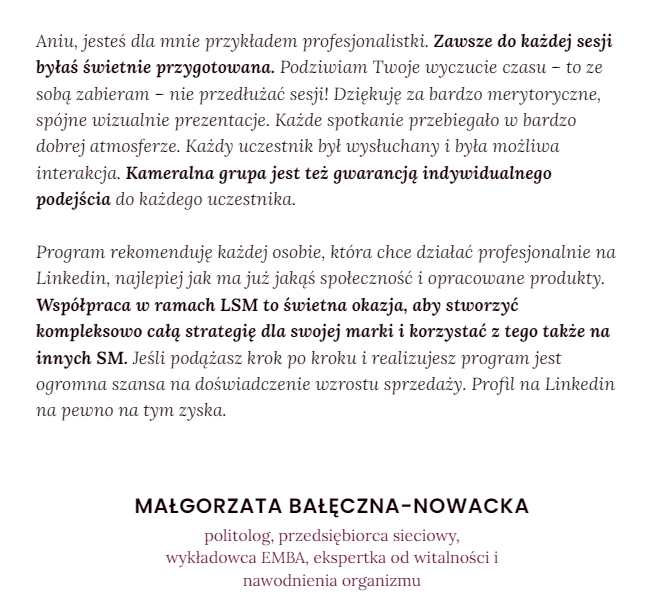 Program rekomenduję każdej osobie, która chce działać profesjonalnie na Linkedin, najlepiej jak ma już jakąś społeczność i opracowane produkty. Współpraca w ramach LSM to świetna okazja, aby stworzyć kompleksowo całą strategię dla swojej marki i korzystać z tego także na innych SM. Jeśli podążasz krok po kroku i realizujesz program jest ogromna szansa na doświadczenie wzrostu sprzedaży. Profil na Linkedin na pewno na tym zyska.