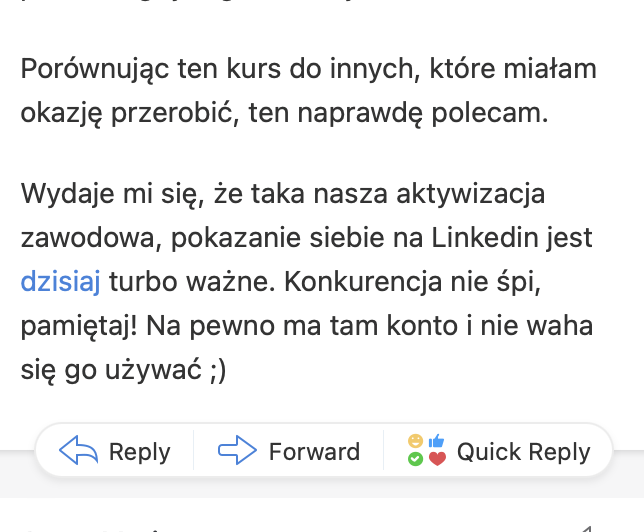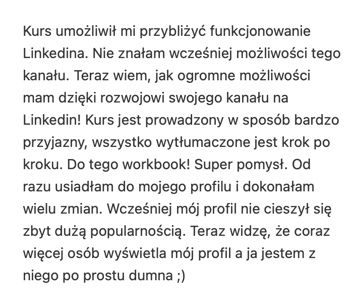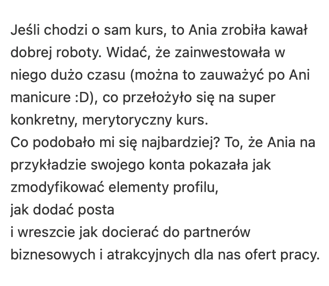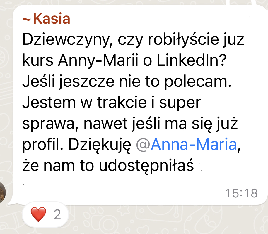 Anna-Maria, tym kursem otworzyłaś mi oczy! Obaliłaś wszystkie mity i pokazałaś, o co tu tak naprawdę chodzi. Bez sensu tak długo zwlekałam z poznaniem LinkedIn.