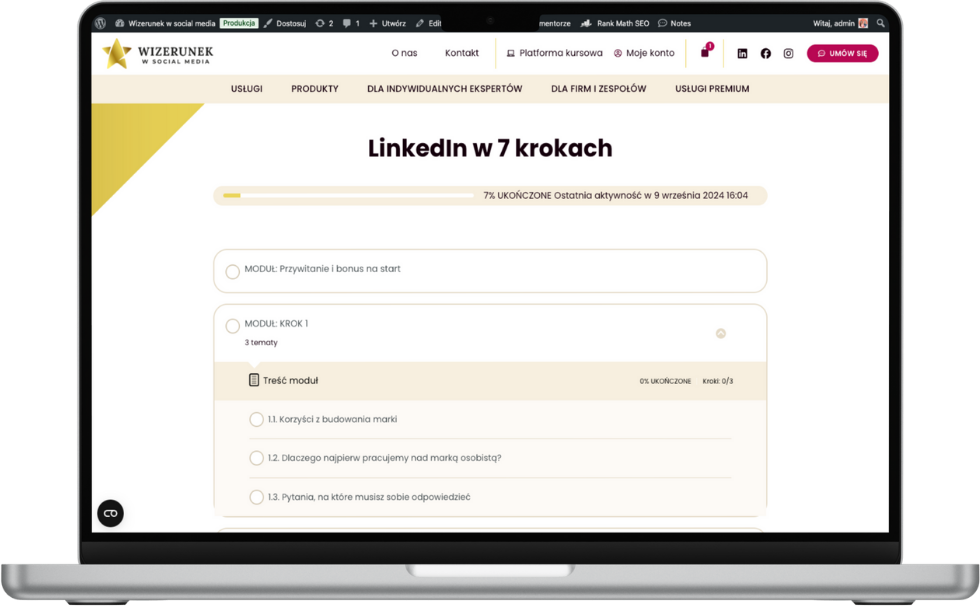 Możesz korzystać ze wsparcia 1:1 lub próbować innych rozwiązań dostępnych na rynku, ale „LinkedIn w 7 krokach: Poznaj i zarabiaj” to nie tylko kurs o LinkedIn, ale i o podstawach budowania marki osobistej.